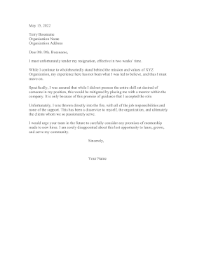 If a new hire was promised on-the-job mentorship and guidance that did not come through, this letter explains that they must resign due to lack of support and training.