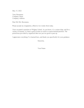 I have accepted a position at Widgets United. As you know, it’s a union shop, and for a variety of reasons, it’s been a goal of mine to work in a union-backed position. The protections provided by organized labor are just too good to pass up.